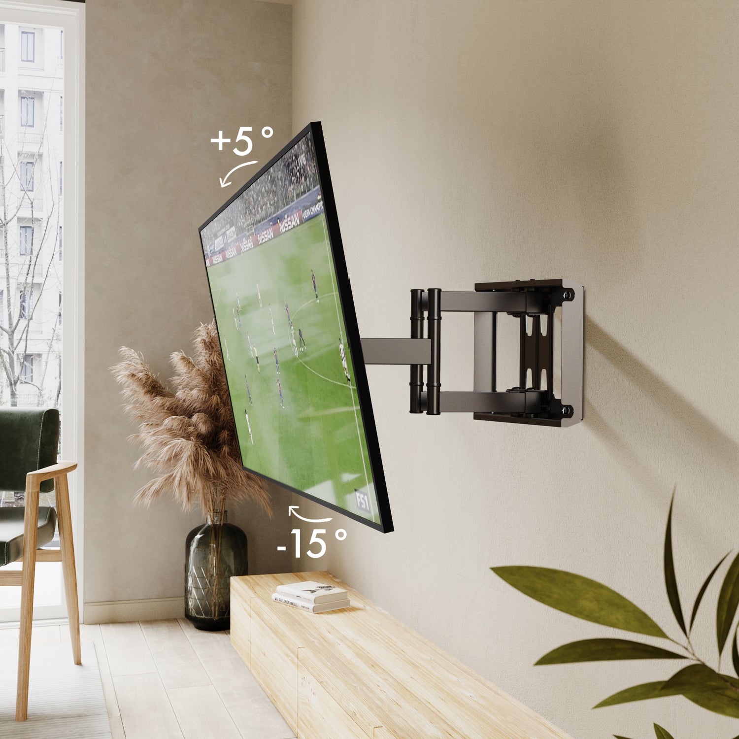 Dostosuj sposób oglądania: Możesz przechylić +5°/-15°, aby zmniejszyć irytujące odblaski. Wzbogać swoje wrażenia kinowe dzięki płynnej i łatwej regulacji kątów widzenia.